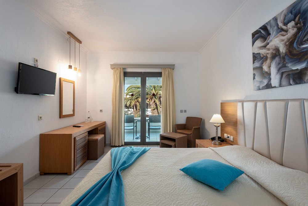 25 sq m2, garden view, terrace or balcony, bath or shower, hairdryer, A/C, satellite TV, refrigerator, direct telephone line, safety deposit box, and Wi-Fi connection (FREE of charge).