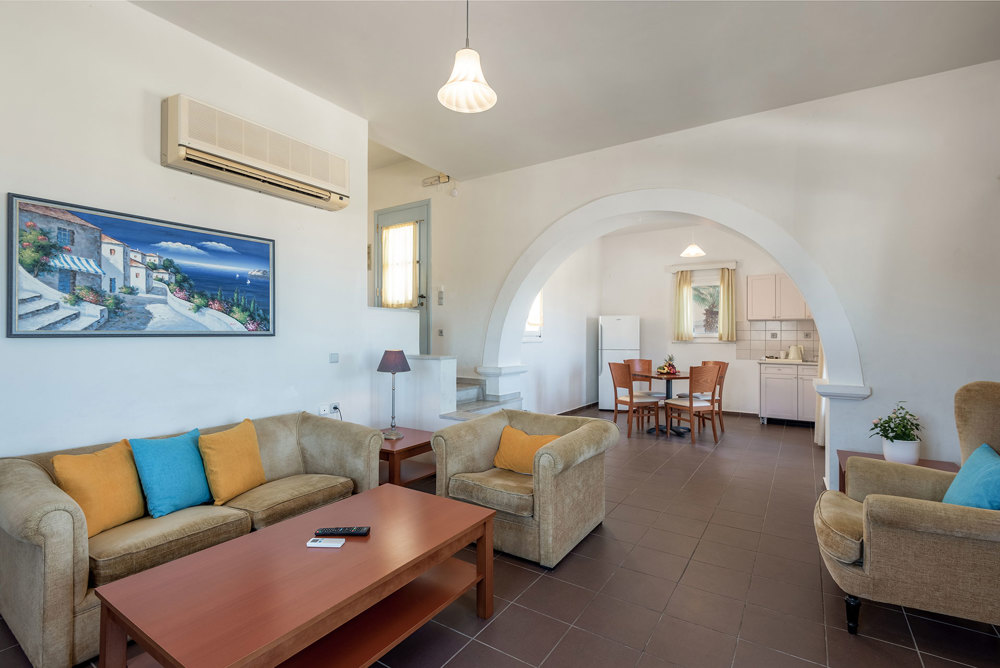 70 sq m2, garden view, terrace or balcony, apartment with two separated bedrooms (1 room with 1 double bed, another room with 2 single beds and an extra bed possible), living room with sofa, fireplace, bath, hairdryer, A/C, satellite flat TV, refrigerator, direct telephone line, safety deposit box, and Wi-Fi connection (FREE of charge) wardrobes, slippers.